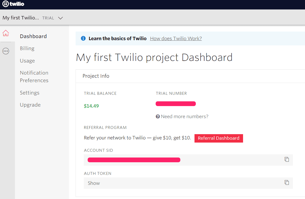 Let’s go ahead and head over to Twilio and either create a trial account or sign in to your existing account if you’ve used their services before. Be sure you verify your own phone number during your account setup, this is so we can send any test texts to our own phone while we develop. On the console page, you should see a red button near the top to create a trial number, click this and make note of what we’ll refer to as your twilio_number this will essentially be your ‘from’ phone number. Just below here you’ll see your account SID, this is what will be your twilio_account in your credentials file, and your auth token is your twilio_token. Fill all this information in within your credentials file and then we can get cracking!