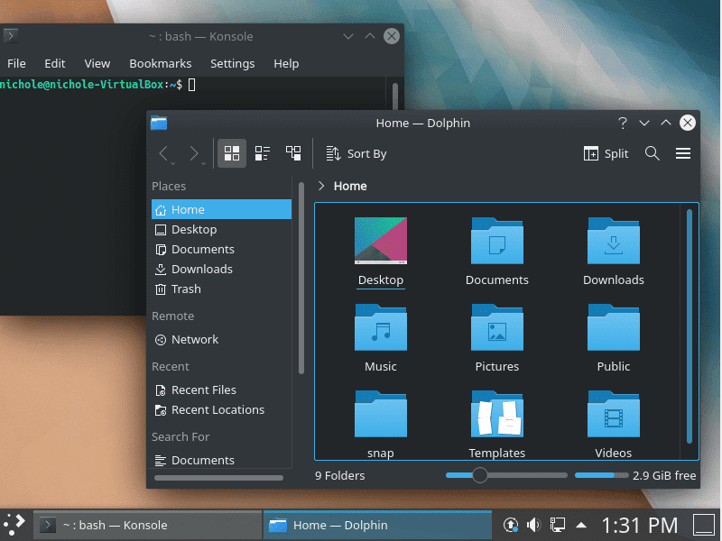 Unfortunately for me, this is where my VM started acting up and having issues with the desktop environment. So I didn’t quite get the full KDE experience but here’s a look at what my environment looked like with the terminal and Dolphin file manager open. This is also where I experienced issues with resolution, but swapping back to GNOME Shell or Budgie works flawlessly still!