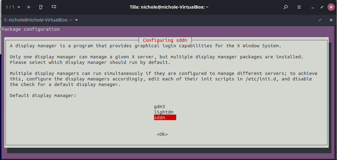 Once it’s all downloaded, you’ll get a prompt to choose your display manager. You’re going to want to select lightdm for Budgie.