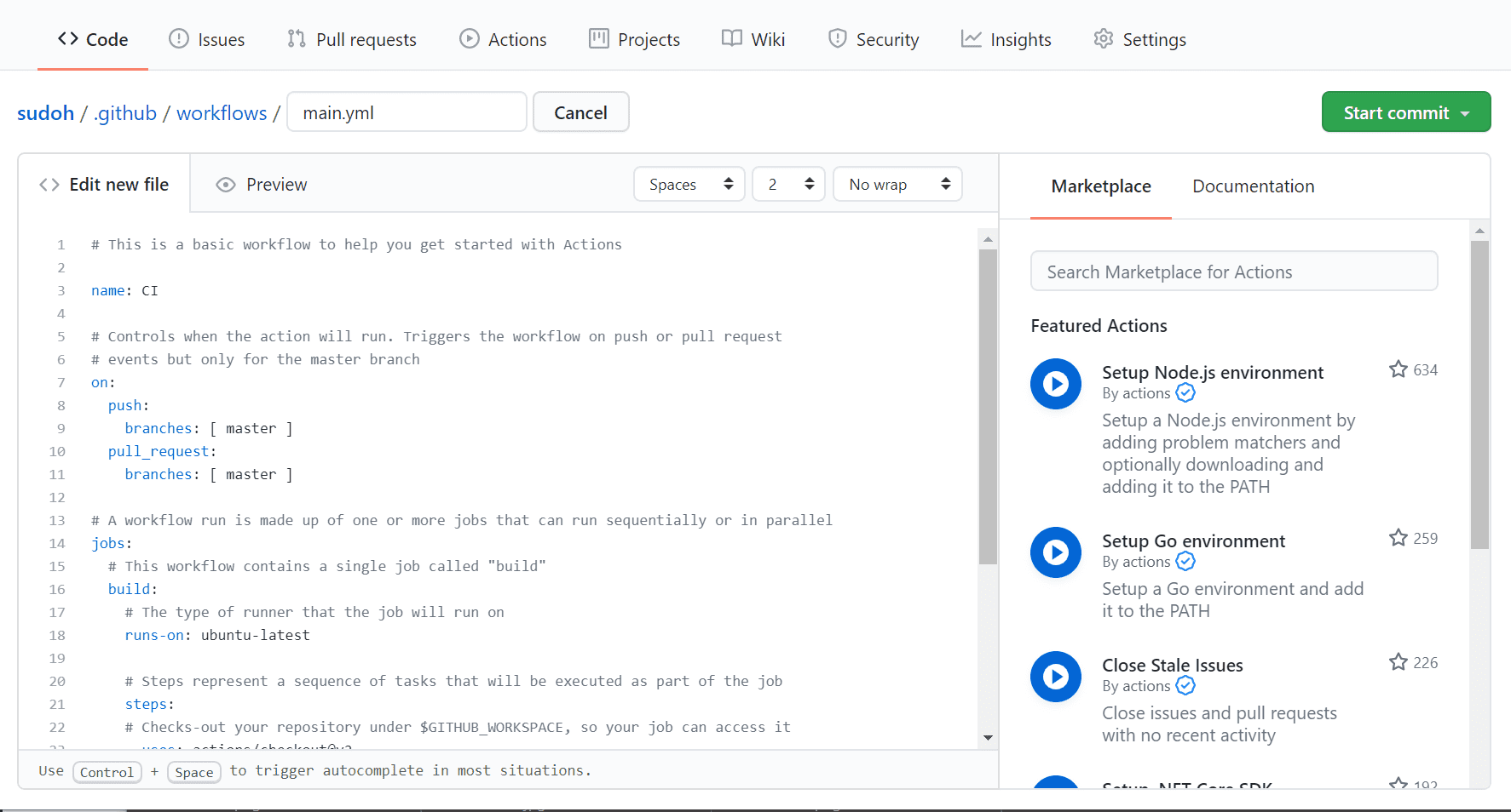 You should now see an example template for your YAML workflow file in the editor. You can rename the file to production.yml if you’d like or just leave it as is. If you’ll be deploying staging or dev environments, it’s a good idea to rename your YAML files appropriately. Click Start commit and go back to your project tp pull the latest change. This workflow file will live in ./github/workflows/