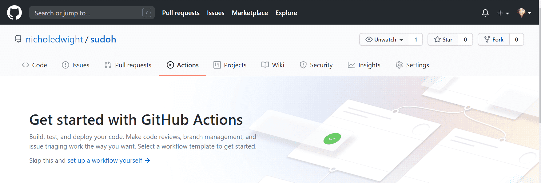 There are two ways to get started with Github Actions, my preferred way is through the Actions tab on my repository on Github, the second way is adding the workflow file directly to the repo itself.