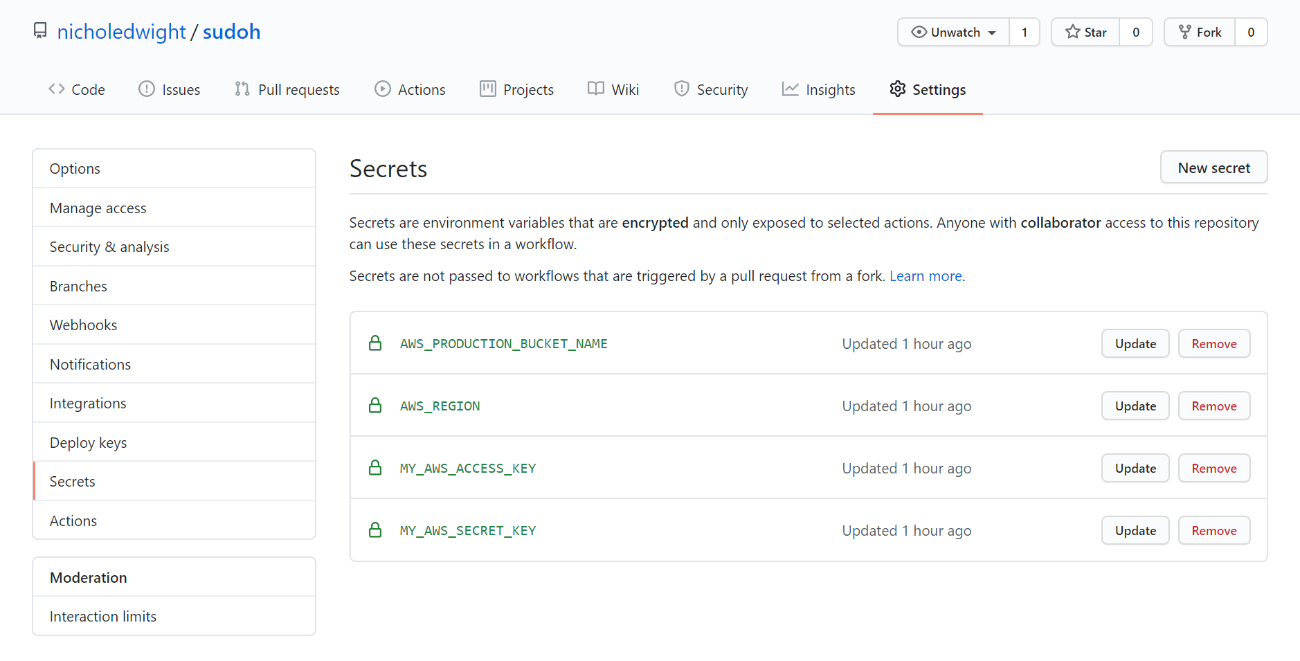 Don’t you worry! Let’s take a moment to head back to your Github repo, under settings -> secrets, you’ll see a button to add New secret to your repo.